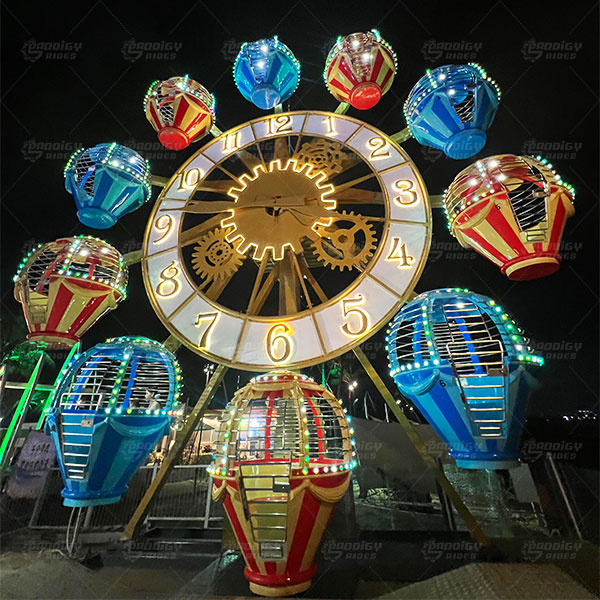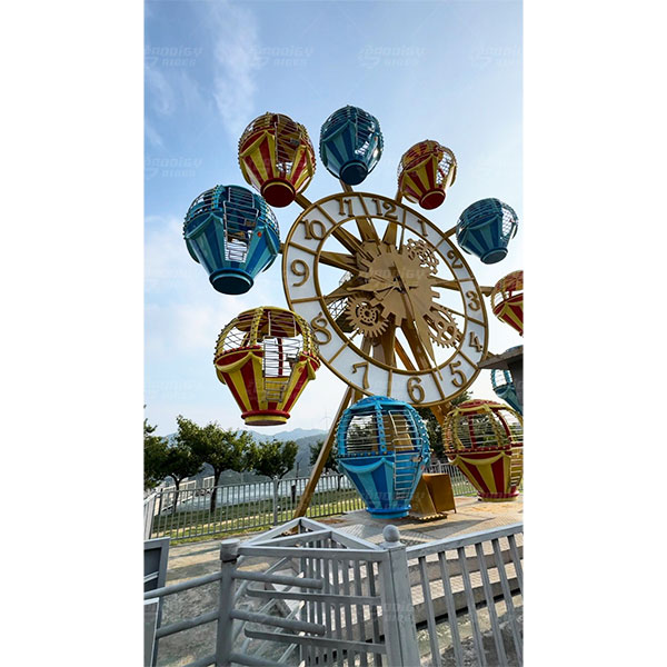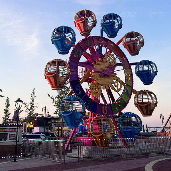The Clock Ferris Wheel is a compact amusement ride that combines the classic Ferris wheel structure with a distinctive clock-themed design. Its attractive appearance and smooth operation make it both an entertaining ride and a visual landmark for amusement parks.